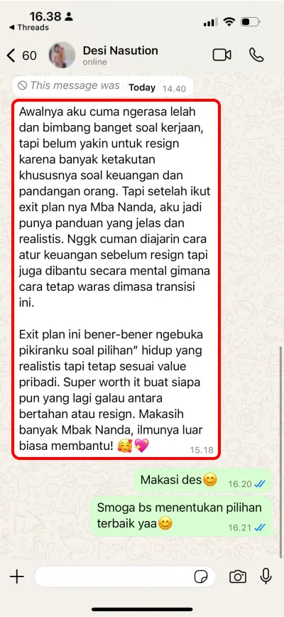 Sangat cocok! Kelas ini justru dirancang untuk membantumu menganalisis apakah resign memang jalan terbaik untukmu, lewat eksplorasi alasan, visi-misi, dan kesiapan mental serta finansial.